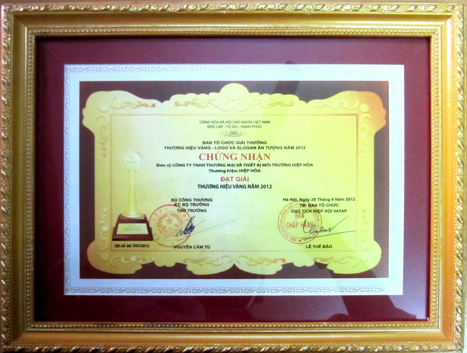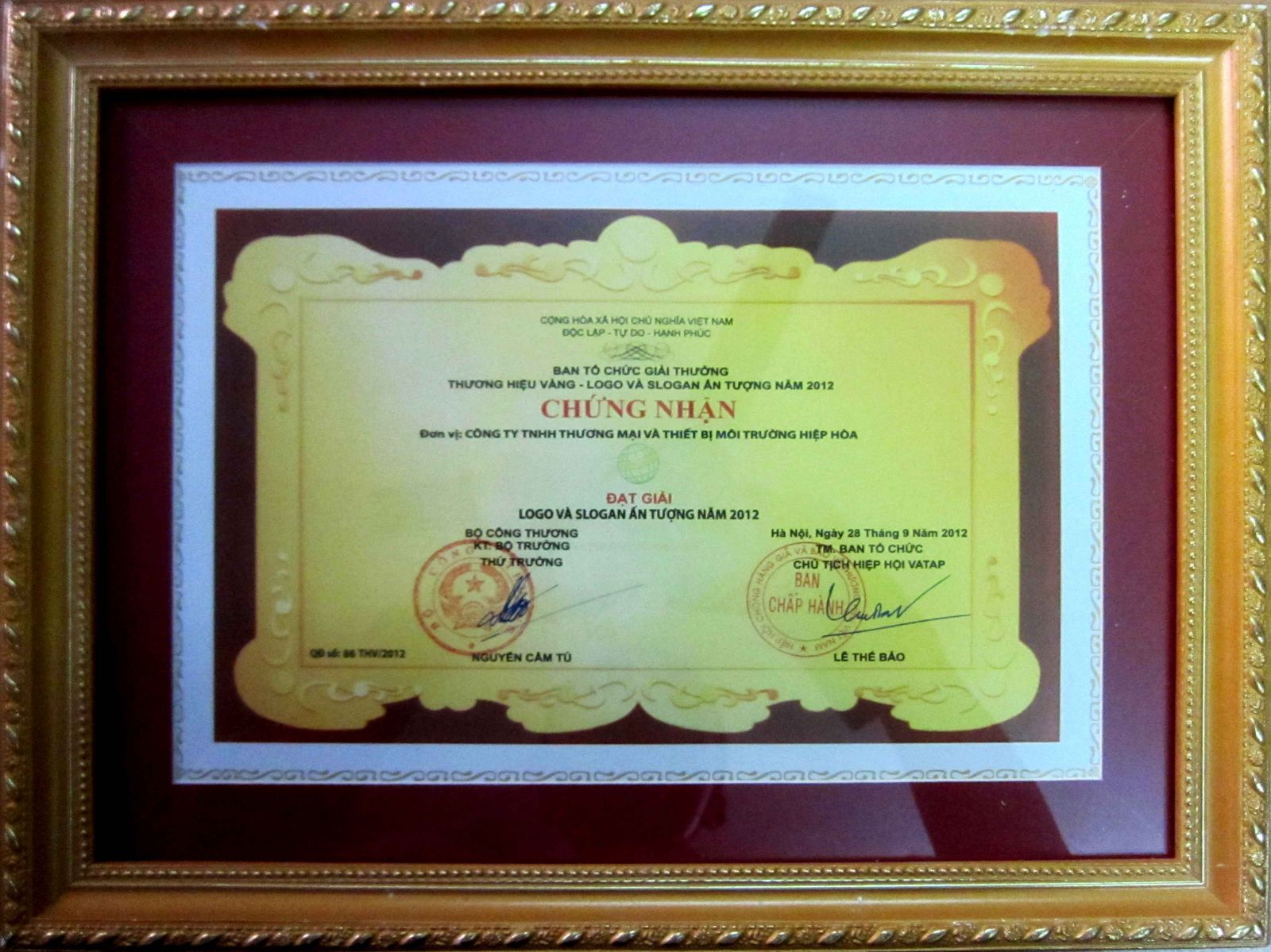 Năm 2012, Công ty TNHH Thương mại và Thiết bị Môi trường Hiệp Hoà đã vượt qua nhiều khó khăn trong sản xuất và kinh doanh, chia sẻ cơ hội và hợp tác với khách hàng và đối tác trong và ngoài nước. Công ty đã giành được giải "Thương hiệu vàng Năm 2012" và "Logo và Slogan ấn tượng Năm 2012"